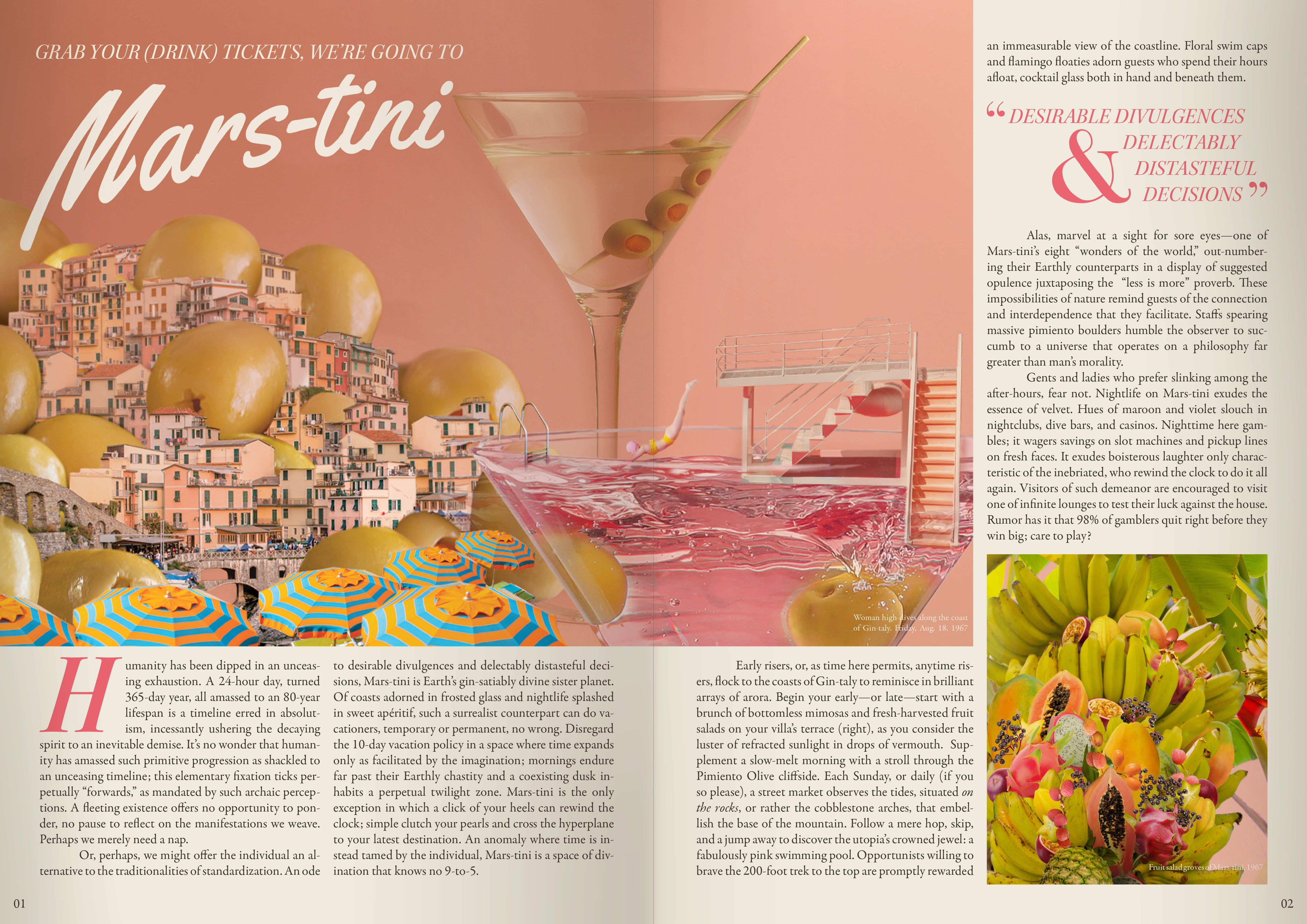 “Drink Ticket” is a conceptual print magazine guided by the philosophy of the martini—a timeless, versatile symbol of luxury. Honoring the cocktail as both a facilitator of connection and a purveyor of elegance, the project reimagines iconic trends from past decades, all preserved within a singular imagined world: Mars-tini, a surrealist dreamscape intended to bring home the surrealist. Inspired by the cheeky anecdotes of the 1950s, each spread fuses elements of old Hollywood glamor, retro-futurism, and Art Nouveau advertising, serving as a vibrant reflection of the artist’s distinct personality and creative vision.