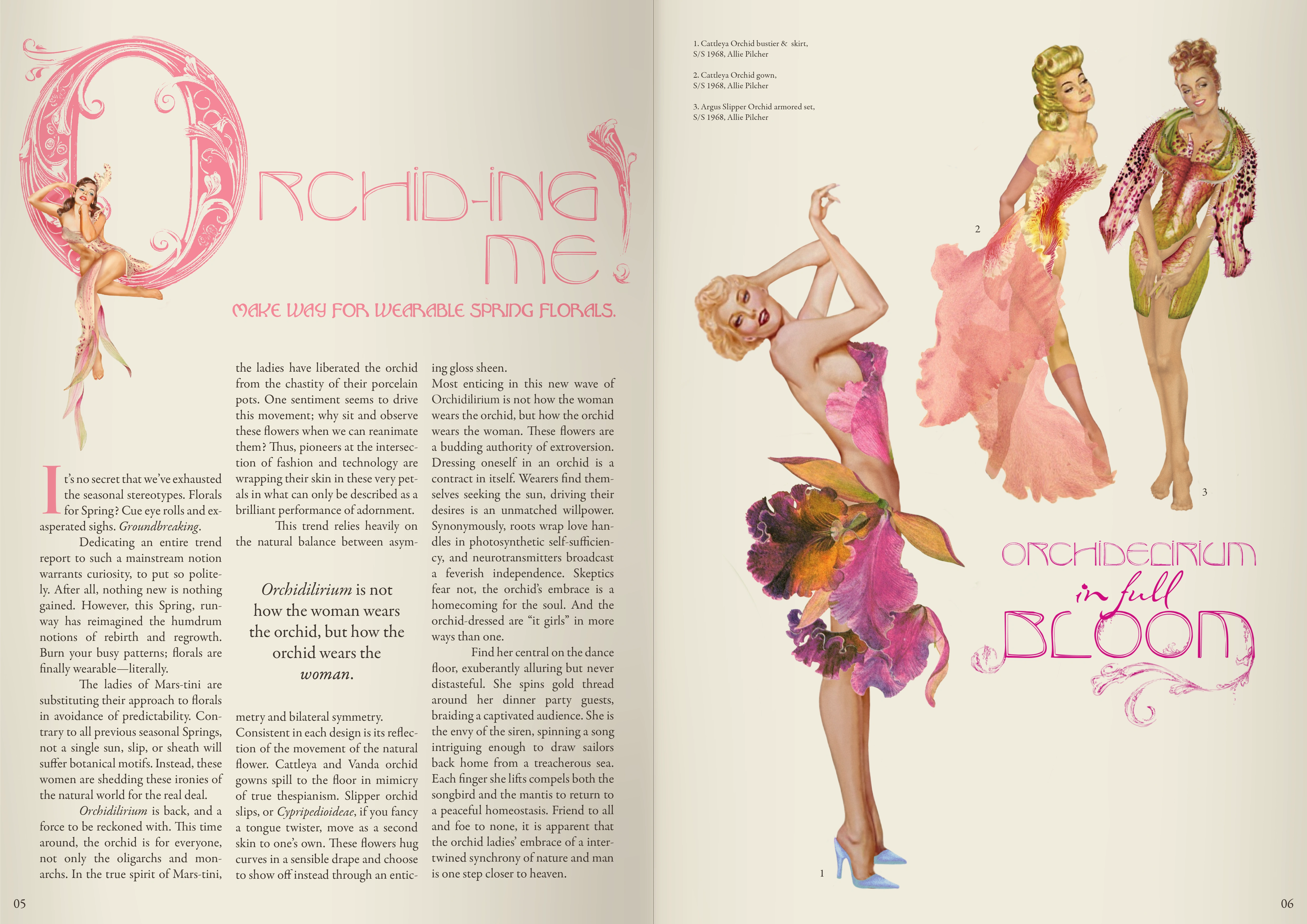 The “Orchid Ladies” were designed as a precursor to the “Orchid-ing Me!” spread, inspired by the Orchidelirium trend of the Victorian Era’s Art Nouveau movement. During this period, orchids became symbols of opulence, with elitists commissioning hunters to procure rare varieties. This body of work reimagines authentic vintage pin-up illustrations by integrating botanical classification imagery of various orchid species, treating each petal as a couture element within a high-fashion context. Through digital painting and advanced masking techniques in Adobe Photoshop, the compositions achieve a seamless fusion of botanical form and stylized femininity, reflecting a harmonious visual symbiosis.