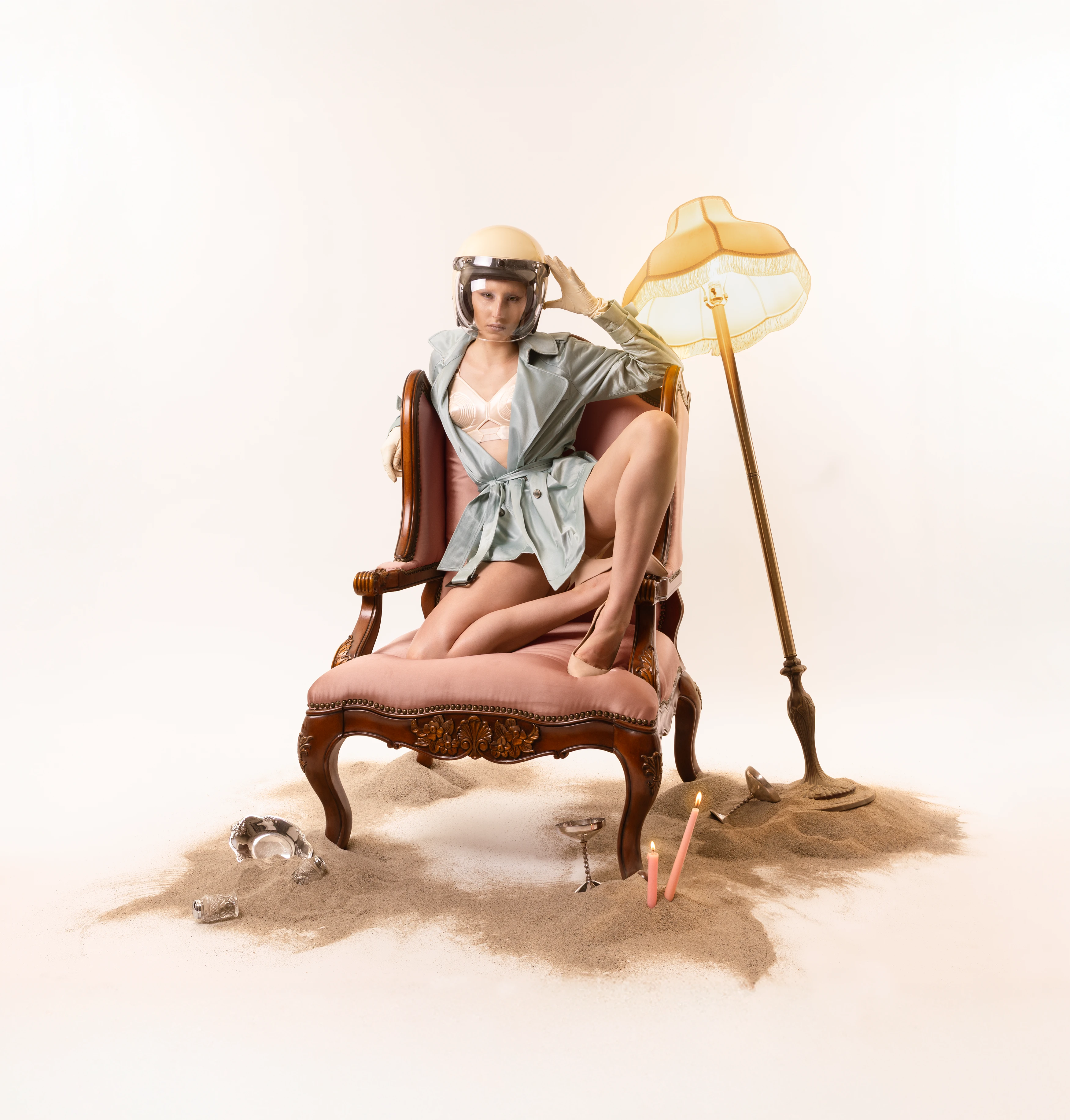 Scattered around her lie the remnants of another age: silver chalices, crystal dinnerware, middle-class mundanity. Once emblems of domestic order, these earthly artifacts appear primitive, relics reframed by evolution.